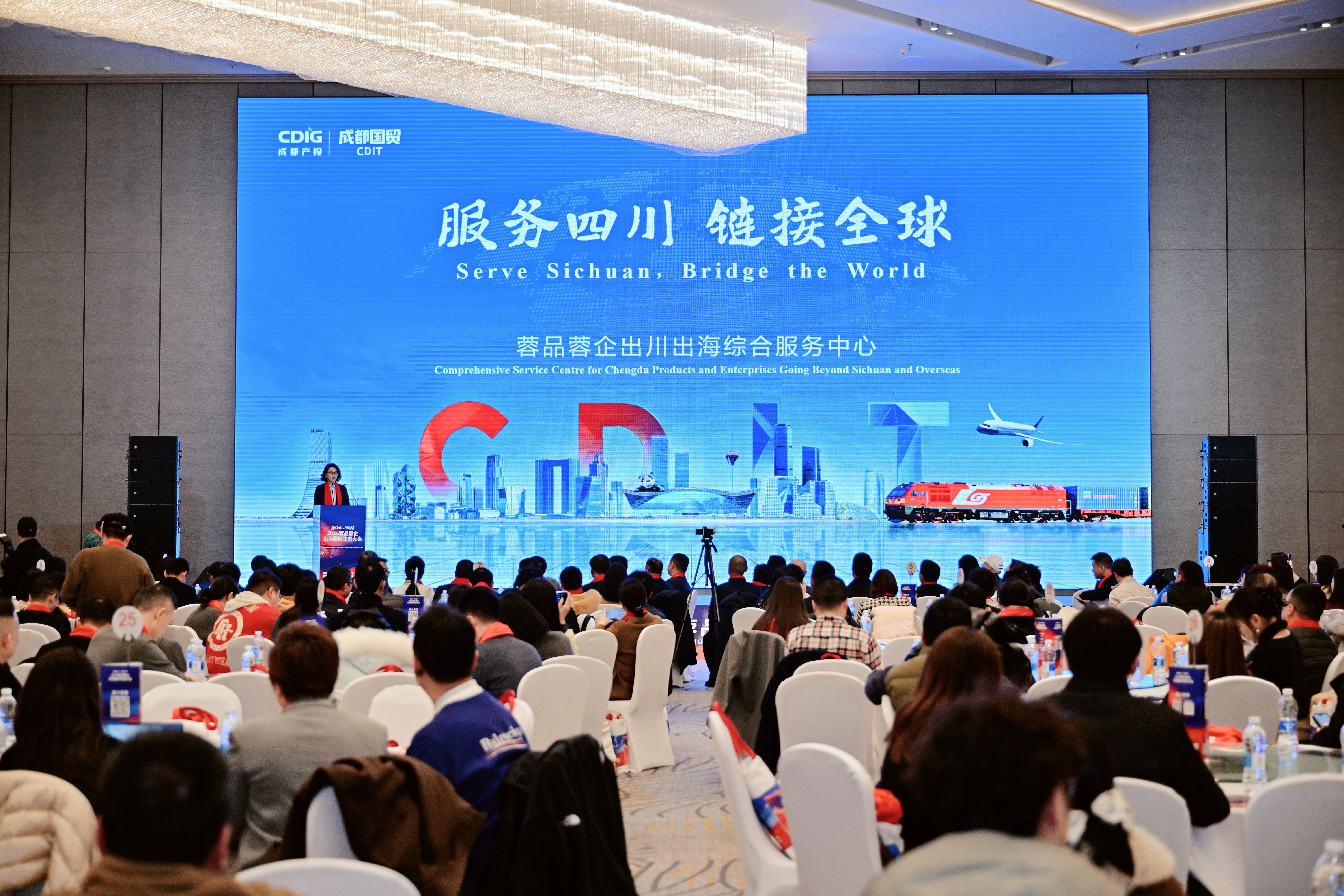 成都市商务局相关领导在大会上致辞,立足国家战略与成都定位,紧扣经贸趋势,阐释“蓉品蓉企出海”战略内涵与政策红利,回顾2025年成都外贸在多方协同下的亮眼成效,明确2026年将从深化服务体系、强化产贸联动、拓展新业态、扩大进口等方面,为企业提供全链条出海支持,诚邀各方携手,助力成都迈向开放前沿,共促双向开放。