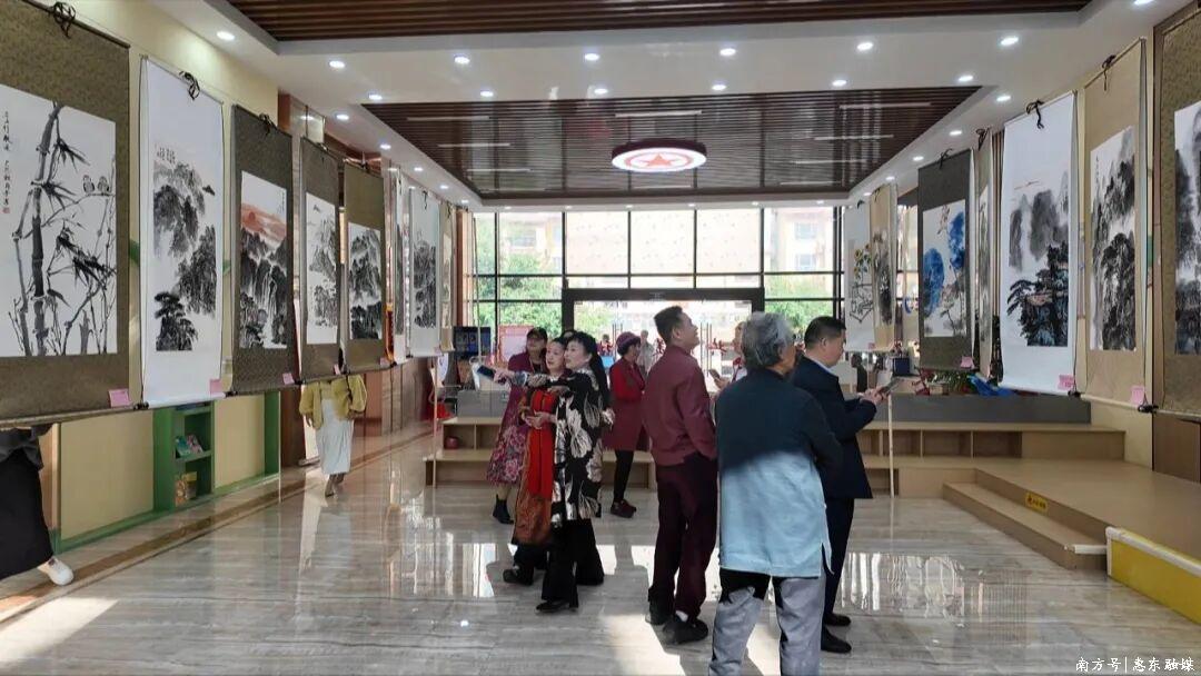 在社区一楼展厅,一幅幅精美的国画作品整齐陈列,山水雄浑壮阔、花鸟灵动多姿,吸引了不少居民驻足观赏。创作者们以笔墨为媒,既描绘了山河美景,也展现出新时代群众的艺术素养和对美好生活的向往。