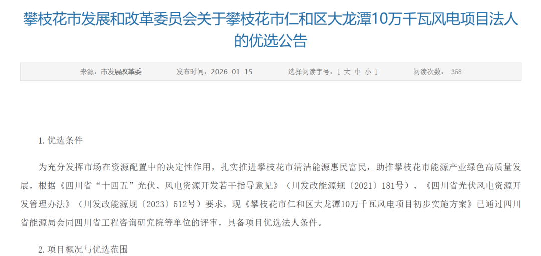 优选公告指出,攀枝花市仁和区大龙潭10万千瓦风电项目位于攀枝花市仁和区大龙潭彝族乡,项目规模10万千瓦。